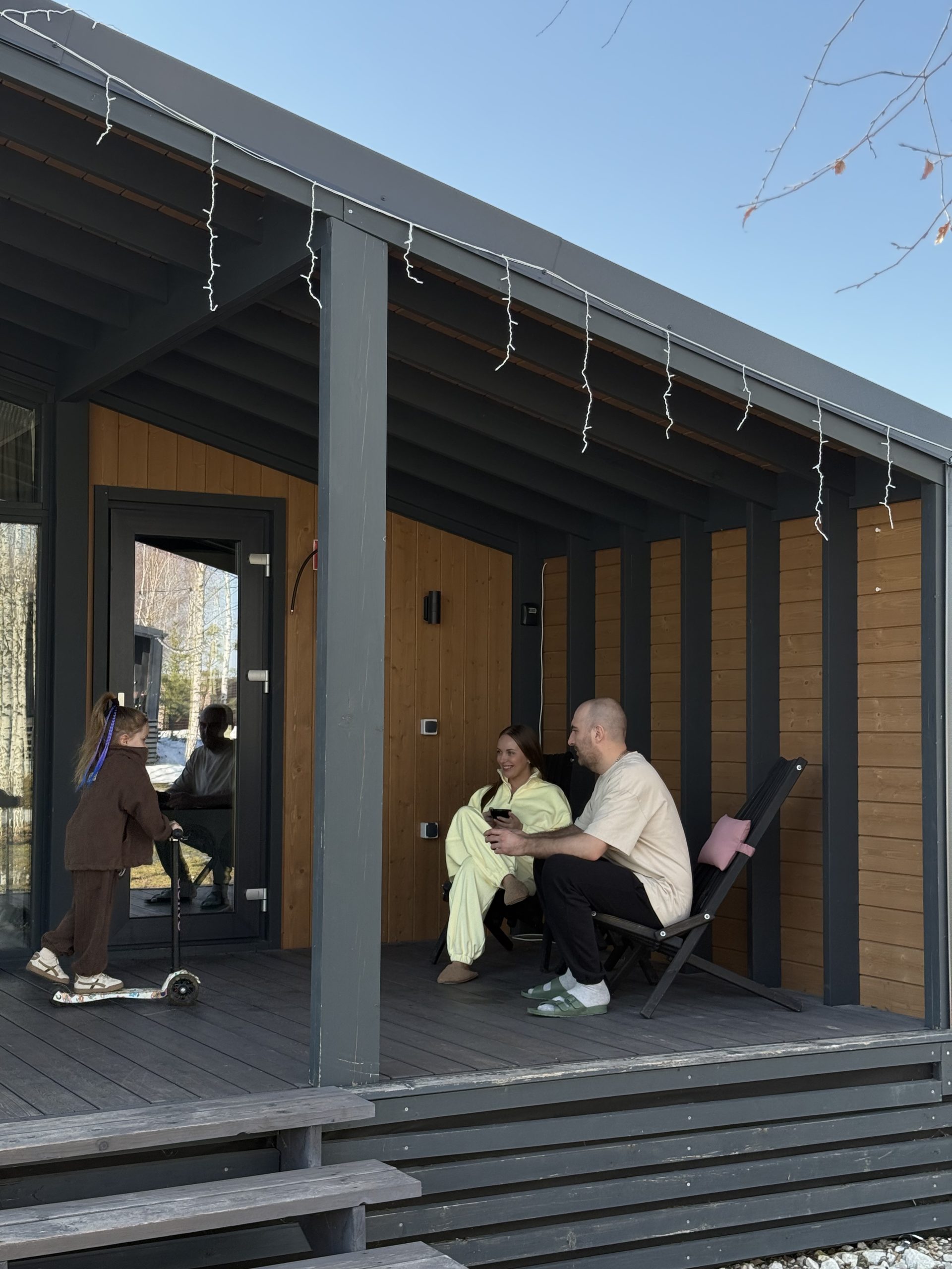 Аренда яркого и просторного спа-дома с сауной и купелью в стиле барнхаус с панорамными окнами, террасой с удобными креслами, идеально подходящей для завтраков под яркими лучами утреннего солнца, и мангальной зоной для уютных вечеров под открытым небом.